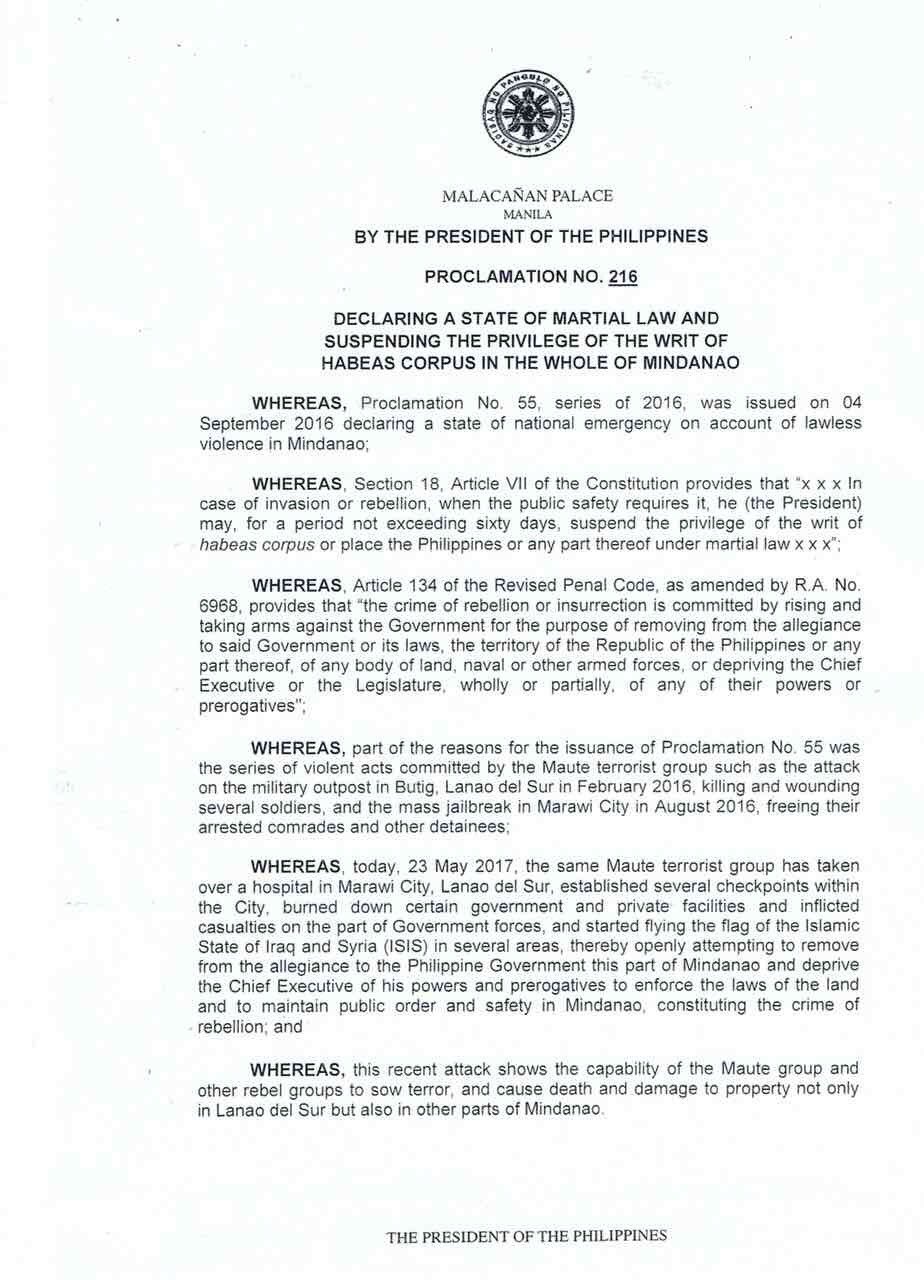 Mara Cepeda On Twitter Look Duterte S Proclamation No 216 Declaring Martial Law Suspending The Privilege Of The Writ Of Habeas Corpus In Mindanao Rapplerdotcom Https T Co Mxhjcvhot0